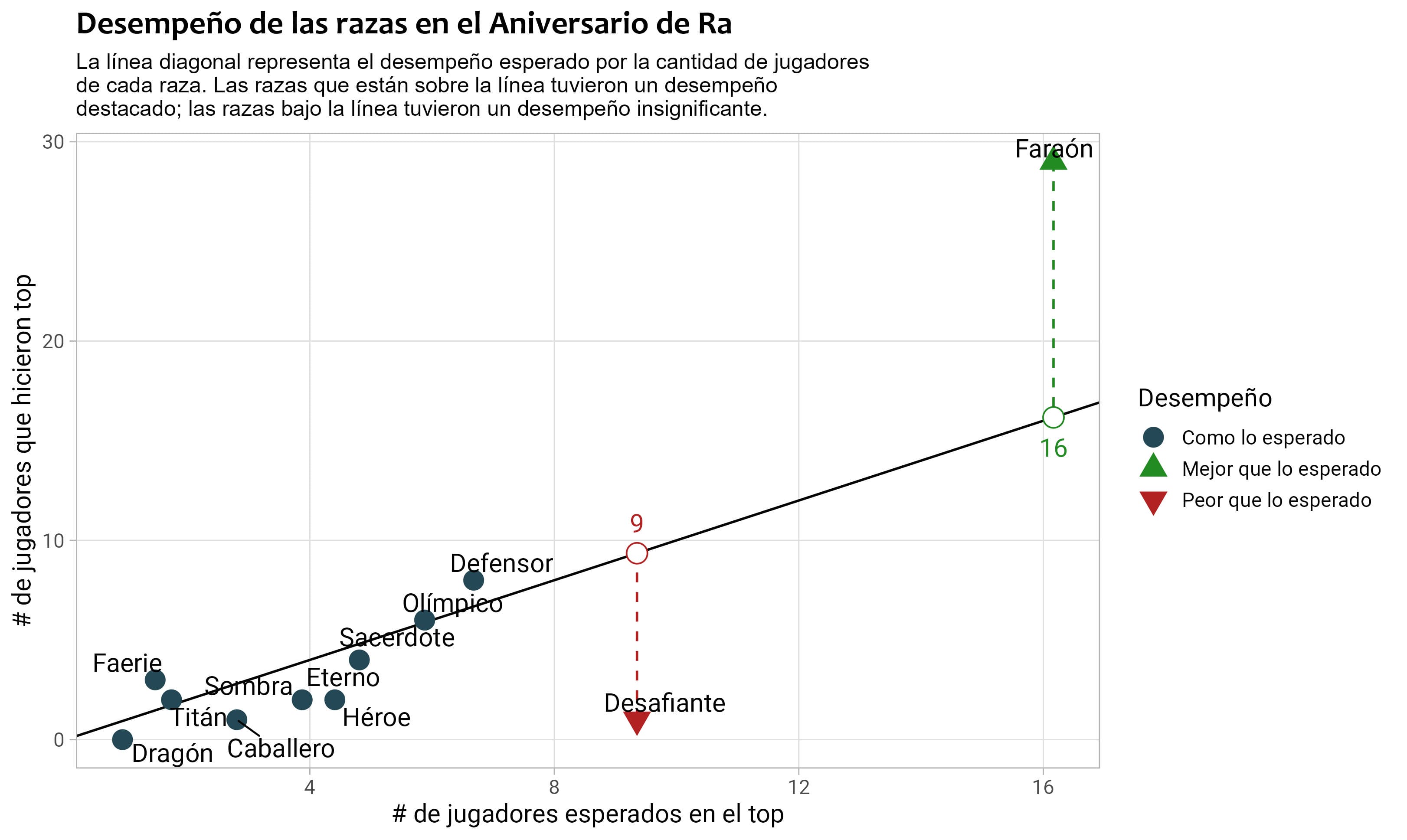 Si agregamos los números a nivel de edición, el gran ganador es Dominios de Ra, superando en 45% la cantidad de jugadores esperada en top. Tanto Helénica como Espada Sagrada estuvieron por debajo de lo esperado, aunque sin evidencia suficiente para asegurar que no fue por azar. El gran perdedor es Hijos de Daana, aunque aquí si hubo significancia estadística🤓 para afirmar que no estuvo al nivel de las demás ediciones.